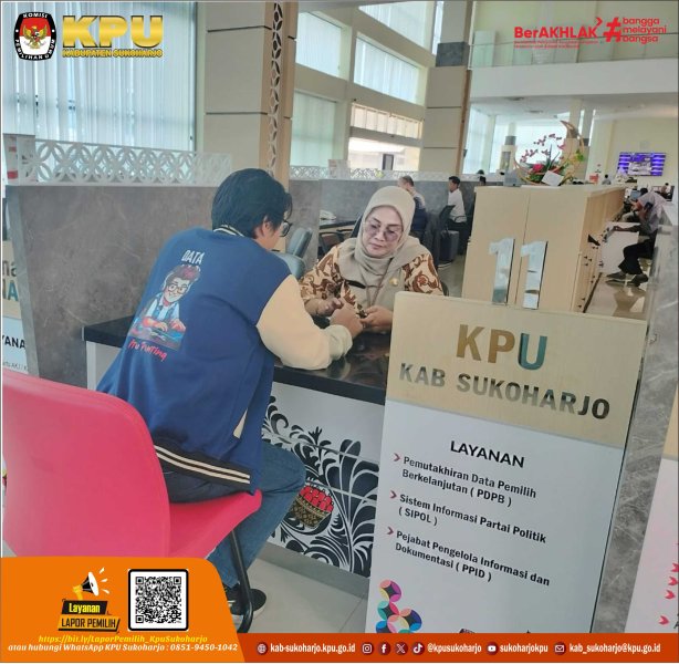 Komisi Pemilihan Umum (KPU) Kabupaten Sukoharjo secara resmi memperluas jangkauan pelayanannya dengan hadir di Mal Pelayanan Publik (MPP) Kabupaten Sukoharjo. Langkah strategis ini diambil melalui kerja sama erat dengan Dinas Penanaman Modal dan Pelayanan Terpadu Satu Pintu (DPMPTSP) Kabupaten Sukoharjo. Kehadiran gerai layanan KPU di MPP ini bertujuan untuk memberikan alternatif pelayanan yang lebih mudah, nyaman, dan aksesibel bagi seluruh lapisan masyarakat Sukoharjo dalam satu atap. Masyarakat dapat mengakses tiga layanan utama KPU di gerai MPP, antara lain: Layanan Pemutakhiran Data Pemilih Berkelanjutan (PDPB): Masyarakat dapat mengurus atau melakukan pengecekan secara langsung apakah sudah terdaftar sebagai pemilih dalam pemilu atau belum. Layanan Sistem Informasi Partai Politik (SIPOL): Menyediakan fasilitas bagi warga yang ingin mengecek apakah namanya tercantum sebagai anggota partai politik tertentu atau tidak. Layanan Pejabat Pengelola Informasi dan Dokumentasi (PPID): Memberikan ruang bagi masyarakat untuk mengajukan permintaan informasi resmi terkait kepemiluan secara transparan sebagai bagian mewujudkan keterbukaan informasi publik Ketua KPU Kabupaten Sukoharjo, Syakbani Eko Raharjo, menegaskan bahwa kehadiran KPU di MPP merupakan bentuk nyata komitmen lembaga dalam melayani hak konstitusional warga. "Kami berharap masyarakat dapat memanfaatkan pelayanan kami yang ada di Mal Pelayanan Publik ini semaksimal mungkin. Hal ini merupakan komitmen KPU Sukoharjo dalam memberikan pelayanan prima yang lebih dekat dan transparan kepada masyarakat," ujar Syakbani. KPU Kabupaten Sukoharjo mengundang seluruh warga untuk tidak ragu berkunjung dan memanfaatkan fasilitas ini. Gerai layanan KPU siap menyambut kehadiran Anda di Mal Pelayanan Publik Sukoharjo. "Kami tunggu masyarakat Sukoharjo di Mal Pelayanan Publik"