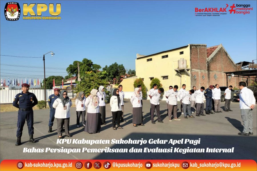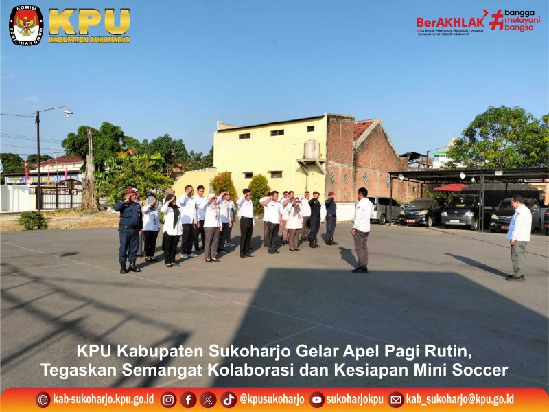 Sukoharjo – Komisi Pemilihan Umum (KPU) Kabupaten Sukoharjo melaksanakan apel pagi rutin pada hari Senin, 21 Juli 2025, bertempat di halaman kantor KPU Kabupaten Sukoharjo. Apel ini diikuti oleh seluruh jajaran sekretariat, dengan Boedi Sulistyo selaku Sekretaris KPU Kabupaten Sukoharjo bertindak sebagai pembina apel. Dalam arahannya, Boedi menyampaikan pentingnya kesiapan seluruh jajaran dalam menghadapi Pemeriksaan yang saat ini dilaksanakan pemeriksaan pendahuluan di KPU Provinsi. Ia menekankan bahwa setiap bagian harus mulai melakukan pengecekan ulang dan penataan dokumen serta administrasi pendukung sesuai dengan ketentuan yang berlaku. Tak hanya itu, Boedi juga memberikan apresiasi terhadap pelaksanaan kompetisi mini soccer yang digelar pada hari Jumat sebelumnya. Kegiatan tersebut dinilai sukses memperkuat kebersamaan dan semangat kerja di lingkungan KPU Sukoharjo. Untuk pelaksanaan berikutnya pada Jumat mendatang, Boedi mengimbau agar dipersiapkan dengan lebih baik dari segi teknis maupun jadwal pelaksanaan. Sebagai penutup, Boedi mengumumkan bahwa mulai minggu depan, komisioner KPU Kabupaten Sukoharjo akan dijadwalkan secara bergiliran menjadi pembina apel pagi. Hal ini dimaksudkan untuk meningkatkan dan memperkuat koordinasi antarpihak. Apel pagi berlangsung tertib, dengan suasana penuh semangat dan komitmen dalam meningkatkan kinerja kelembagaan.