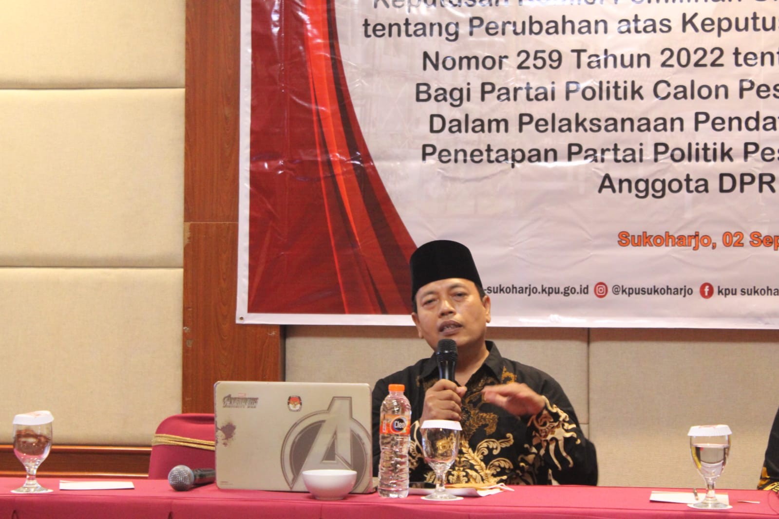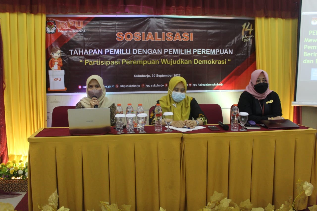 PLH Ketua KPU Sukoharjo Syakbani Eko Raharjo didampingi Anggota KPU Ita Efiyati, Suci Handayani , dalam sambutannya mengatakan bahwa Pemilihan Umum agenda demokrasi di Indonesia yang sudah berlangsung rutin lima tahun sekali, tahapan Pemilu tahun 2024 saat ini pada tahapan verifikasi administrasi parpol calon peserta Pemilu 2024. Dalam Pemilu salah satu pemilih adalah perempuan yang dari sisi jumlah besar dan menjadi pemilih potensial.