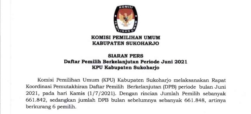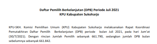 KPU-SKH. Komisi Pemilihan Umum (KPU) Kabupaten Sukoharjo melaksanakan Rapat Koordinasi Pemutakhiran Daftar Pemilih Berkelanjutan (DPB) periode bulan Juli 2021, pada hari Jum’at (30/7/2021). Dengan rincian Jumlah Pemilih sebanyak 661.790, sedangkan jumlah DPB bulan sebelumnya sebanyak 661.842.