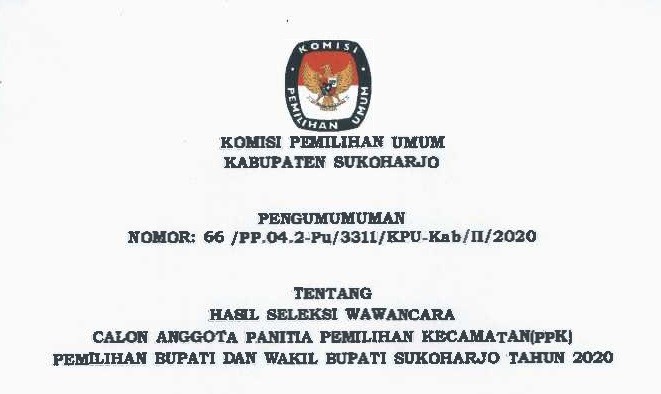 Sebagaimana diketahui, pendaftar calon PPK sejumlah 265 orang (L=180, P=85) dengan jumlah pendaftar terbanyak dari kecamatan Sukoharjo 40 orang, dikuti kecamatan Kartasura, Grogol dan Bendosari masing-masing dengan 28 pendaftar. Sementara kecamatan Weru paling kecil peminatnya yaitu hanya 14 pendaftar. (SH)