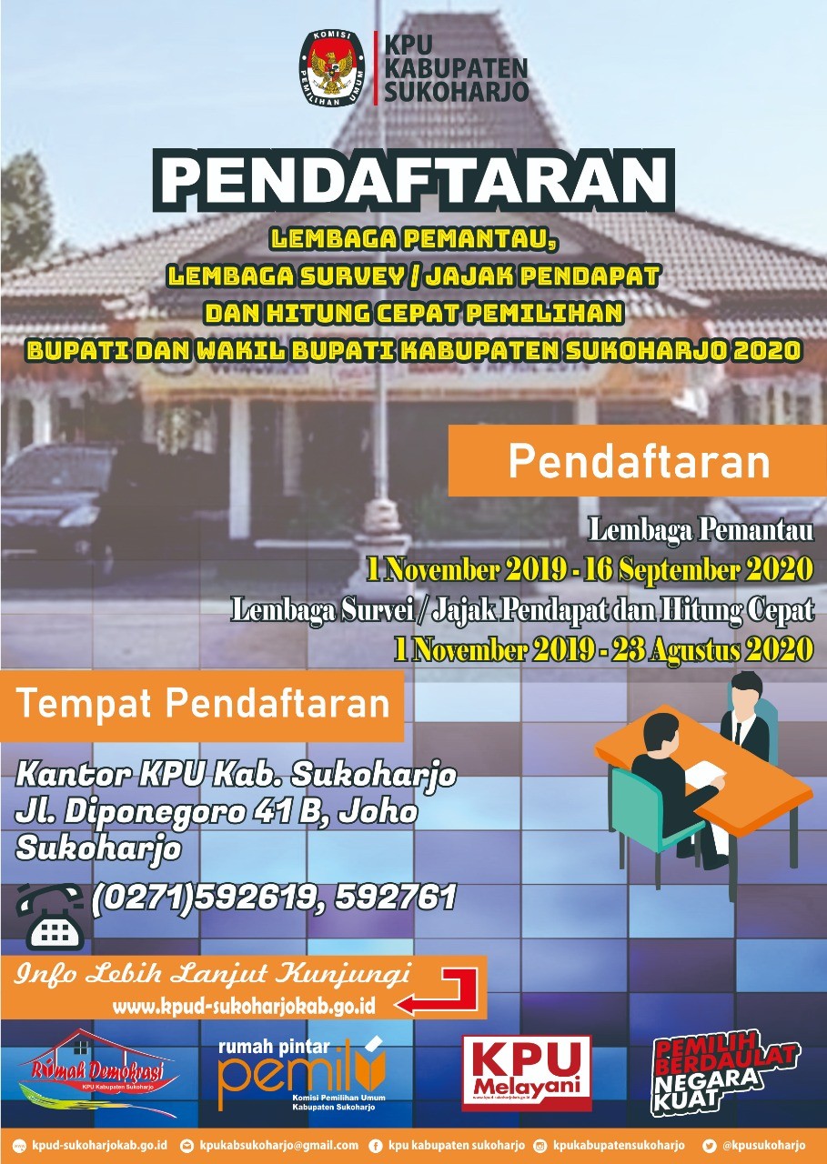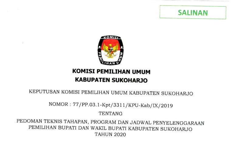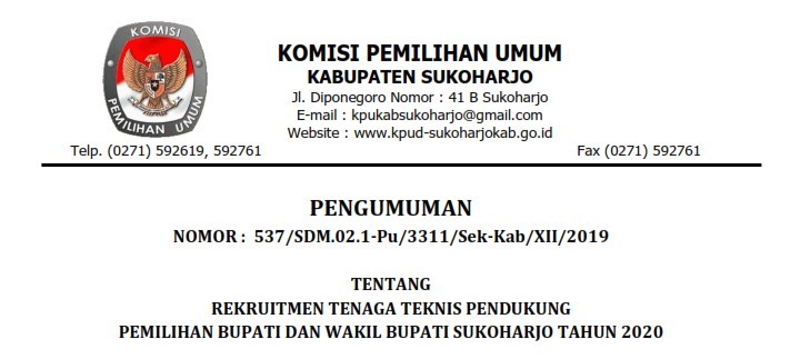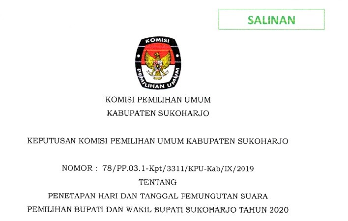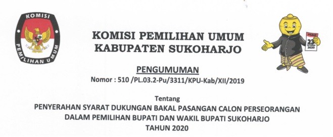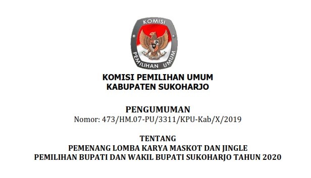 KPU-SKH-Berdasarkan Keputusan Komisi Pemilihan Umum Kabupaten Sukoharjo, Nomor: 80 /HK.03.01-Kpt/3311/KPU-Kab/X/2019 tentang Penetapan Pemenang Lomba Karya Maskot dan Jingle Pemilihan Bupati dan Wakil Bupati Sukoharjo Tahun 2020. Dengan ini KPU Kabupaten Sukoharjo mengumumkan Pemenang Lomba Karya Maskot dan Jingle.