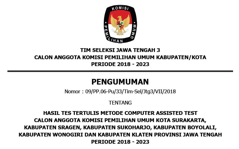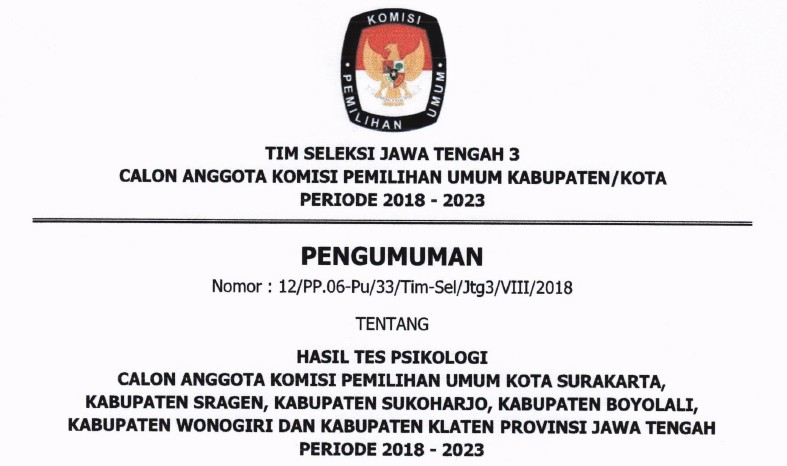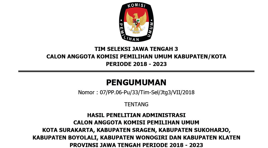 Berikut ini kami sampaikan Hasil penelitian Administrasi calon anggota KPU Kota Surakarta, Kabupaten Sragen, Kabupaten Sukoharjo, Kabupaten Boyolali, Kabupaten Wonogiri Dan Kabupaten Klaten Periode 2018 - 2023