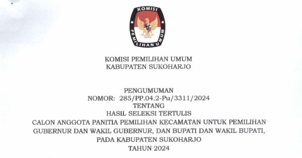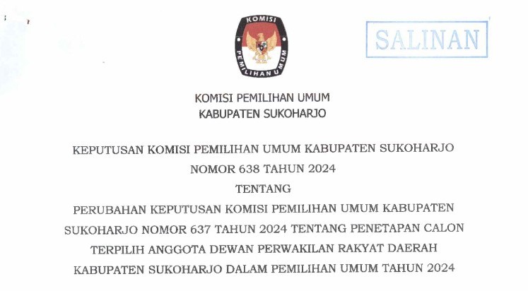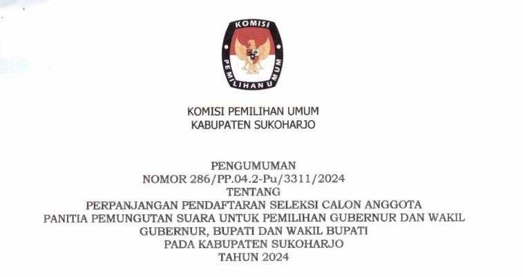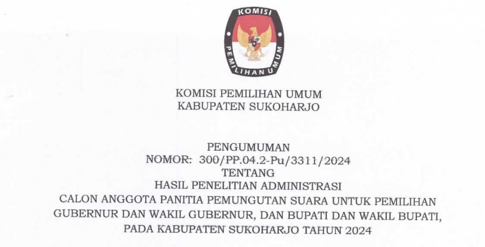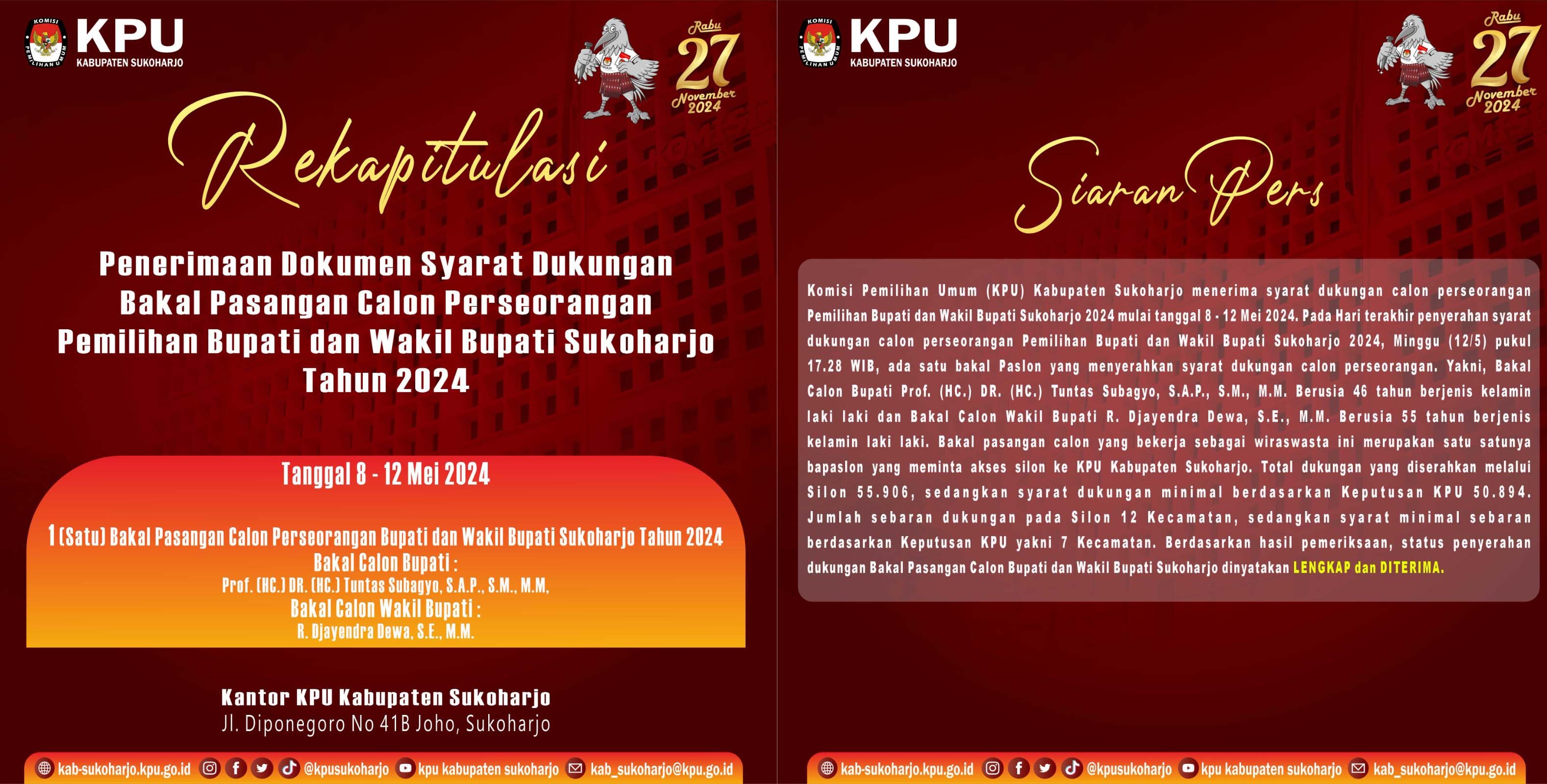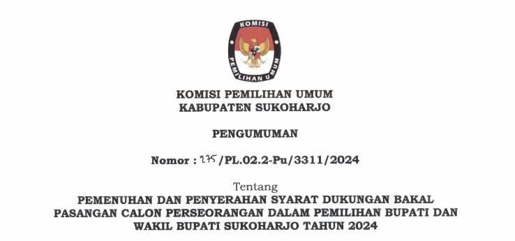 Komisi Pemilihan Umum (KPU) Kabupaten Sukoharjo menerima syarat dukungan calon perseorangan Pemilihan Bupati dan Wakil Bupati Sukoharjo 2024. Yakni dari bakal pasangan calon Bupati dan Wakil Bupati Sukoharjo Tuntas Subagyo dan R. Djayendra Dewa. Ketua KPU Kabupaten Sukoharjo Syakbani Eko Raharjo mengatakan bahwa hari terakhir syarat dukungan calon perseorangan Pemilihan Bupati dan Wakil Bupati Sukoharjo 2024, Minggu (12/4) pukul 17.28 ada satu bakal Paslon yang menyerahkan syarat dukungan calon perseorangan. Yakni, Bakal Calon Bupati Prof. (HC.) DR. (HC.) Tuntas Subagyo, S.A.P., S.M., M.M.Berusia 46 tahun berjenis kelamin laki laki. Dan Bakal Calon Wakil Bupati: R. Djayendra Dewa, S.E., M.M.Berusia 55 tahun dan berjenis kelamin laki laki.Bakal pasangan calon yang bekerja sebagai wiraswasta ini merupakan satu satunya bapaslon yang meminta akses silon ke kpu sukoharjo. "Dalam penerimaan persyaratan dukungan Bakal Pasangan Calon Bupati dan Wakil Bupati, Komisi Pemilihan Umum Kabupaten melakukan berbagai kegiatan. Seperti, memastikan waktu penyerahan dokumen dukungan; memeriksa kelengkapan naskah bentuk fisik surat penyerahan dokumen dukungan Pasangan Calon perseorangan dan jumlah dukungan," kata Syakbani, Minggu (12/5). Selain itu, lanjut Syakbani, pihaknya juga memeriksa kesesuaian surat penyerahan dokumen dukungan Pasangan Calon perseorangan dan jumlah dukungan; memeriksa kelengkapan surat pernyataan dukungan masing-masing pendukung memeriksa kelengkapan dokumen surat pengunduran diri bagi bakal calon perseorangan yang berstatus sebagai penjabat Gubernur, penjabat Bupati, atau penjabat Walikota; memeriksa kelengkapan dokumen laporan pencalonan kepada pejabat pembina kepegawaian bagi bakal calon perseorangan yang berstatus sebagai anggota Tentara Nasional Indonesia dan Kepolisian Negara Republik Indonesia; memeriksa kelengkapan surat pengunduran diri bagi bakal calon perseorangan yang berstatus sebagai anggota Tentara Nasional Indonesia dan Kepolisian Negara Republik Indonesia; dan memeriksa kelengkapan dokumen surat pengunduran diri bagi bakal calon perseorangan yang berstatus sebagai anggota KPU, KPU Provinsi, KPU Kabupaten/Kota, Bawaslu, Bawaslu Provinsi, atau Bawaslu Kabupaten/Kota. "Berdasarkan hasil pemeriksaan, status penyerahan dukungan Bakal Pasangan Calon Bupati dan Wakil Bupati Sukoharjo dinyatakan lengkap dan diterima," ungkap Syakbani dalam keterangan persnya di Kantor KPU Kabupaten Sukoharjo. Lebih lanjut dikatakan Syakbani, adapun data dan dokumen persyaratan dukungan Bakal Pasangan Calon tertuang dalam formulir Model Penerimaan dukungan KWK-KPU atas nama Bakal Pasangan Calon yang bersangkutan. "Penerimaan syarat dukungan calon perseorangan Pemilihan Bupati dan Wakil Bupati Sukoharjo 2024 akan ditutup pada Minggu (12/5) pukul 23.59," bebernya. Dijelaskan Syakbani, total dukungan yang diserahkan melalui Silon 55.906, sedangkan syarat dukungan minimal berdasarkan Keputusan KPU 50.894. Sehingga, status jumlah dukungan minimal dalam penyerahan dukungan awal memenuhi syarat dukungan minimal. Lalu, jumlah sebaran dukungan pada Silon 12 Kecamatan. Sedangkan syarat minimal sebaran berdasarkan Keputusan KPU yakni 7 Kecamatan. "Status jumlah sebaran dukungan dalam penyerahan dukungan awal memenuhi syarat sebaran minimal," katanya. Selanjutnya, dokumen yang diterima akan dilakukan verifikasi administrasi dengan melihat kembali kesesuaian dokumen dukungan dan KTP yang diserahkan yang dilaksanakan pada 13 - 29 Mei 2024. Kemudian, apabila hasil verifikasi administrasi dinyatakan memenuhi syarat minimal dukungan, KPU turunkan petugas untuk melakukan verifikasi faktual ke rumah-rumah warga guna memastikan kebenaran pemberi dukungan terhadap Bacalon. Tahap berikut adalah penyerahan perbaikan jika ada terjadi kekurangan yang ditemukan.