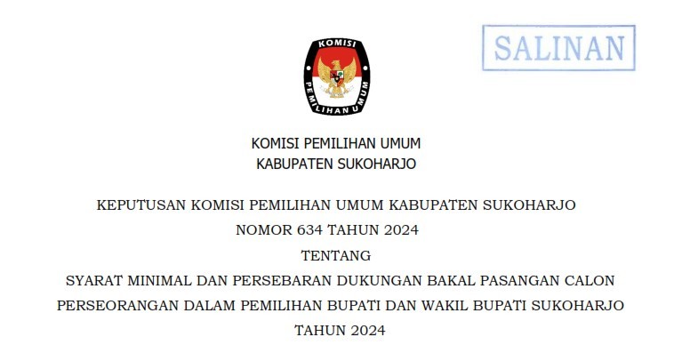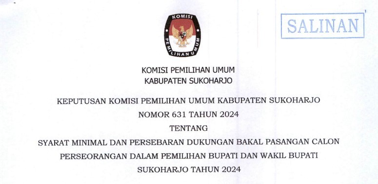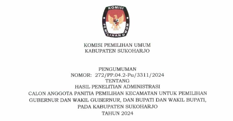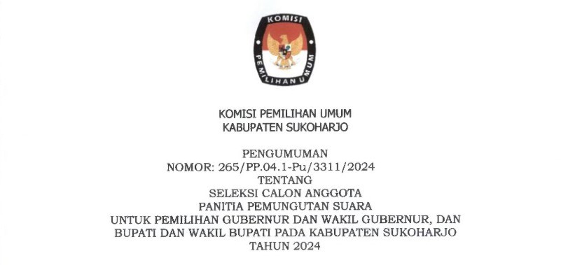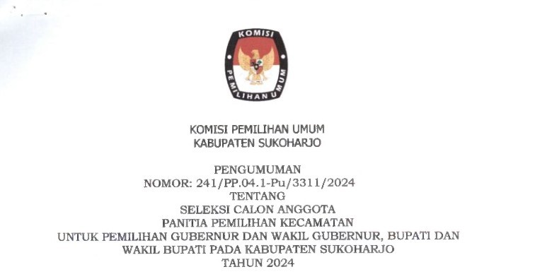Dalam rangka pemilihan Gubernur dan Wakil Gubernu, Bupati dan wakil bupati pada kabupaten Sukoharjo tahun 2024, KPU Kabupaten Sukoharjo mengundang WNI yang memenuhi kualifikasi untuk menjadi Panitia Pemilihan Kecamatan atau PPK dengan ketentuan seperti :