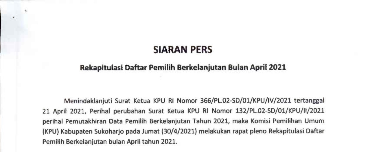 KPUSKH-Komisi Pemilihan Umum (KPU) RI menyelenggarakan Focus Group Discussion (FGD) Program Desa Peduli Pemilu dan Pemilihan. Program desa peduli pemilu dan pemilihan merupakan bagian dari Pendidikan pemilih Pemilihan Umum (Pemilu) dan Pemilihan Gubernur dan Wakil Gubernur, Bupati dan Wakil Bupati, dan/atau Wali Kota dan Wakil Wali Kota (Pemilihan) merupakan elemen penting dalam demokrasi, karena akan melahirkan pemilih yang mandiri dan rasional dimana hal ini merupakan ukuran kualitas demokrasi di suatu Negara. Salah satu indikator pemilih yang mandiri dan rasional yaitu dalam menentukan pilihan politik, ia tidak lagi berorientasi pada kepentingan politik jangka pendek seperti uang, kekuasaan dan kompensasi politik yang bersifat individual. Justru pilihan politik diberikan kepada partai politik atau kandidat yang memiliki kompetensi dan integritas untuk mengelola pemerintahan. Sebab tujuan akhir dari demokrasi adalah kesejahteraan dan keadilan sosial bagi seluruh rakyat. Pendidikan pemilih juga ditujukan untuk meningkatkan pengetahuan dan kepedulian masyarakat tentang kepemiluan. Sikap peduli Pemilu dan Pemilihan diharapkan menumbuhkan pengetahuan, pemahaman dan keterampilan masyarakat tentang Pemilu dan Pemilihan dalam rangka memperkuat basis penerimaan, dukungan, partisipasi dan kepercayaan masyarakat terhadap mekanisme Pemilu sebagai instrument utama sistem politik demokrasi. Peduli Pemilu dan Pemilihan yaitu seperangkat kemampuan yang dibutuhkan pemilih untuk berpartisipasi aktif dalam Pemilu atau Pemilihan. Kemampuan untuk peduli Pemilu dan Pemilihan dibutuhkan sebagai prasyarat partisipasi politik yang ideal, baik selama periode dan di luar periode Pemilu atau Pemilihan. Sikap peduli Pemilu dan Pemilihan yang baik menjadikan pemilih tahu bagaimana harus bersikap dan berpartisipasi aktif dalam sebuah proses politik. Pelaksanaan Desa Peduli Pemilu dan Pemilihan bertujuan untuk: a. membangun kesadaran politik masyarakat agar menjadi pemilih yang berdaulat; b. mengedukasi masyarakat dalam memfilter informasi, sehingga masyarakat tidak mudah termakan isu hoaks terkait kepemiluan; c. menghindarkan masyarakat pada praktik politik uang yang sering terjadi menjelang Pemilu dan Pemilihan; d. meningkatkan kuantitas dan kualitas partisipasi pemilih; dan e. membentuk kader yang mampu menjadi penggerak dan penggugah kesadaran politik masyarakat. FGD ini mneghadirkan narasumber : I Dewa Kade Wiarsa Raka Sandi (Anggota KPU RI Divisi Sosialisasi Pendidikan Pemilih dan Partisipasi Masyarakat ) Dr. Drs Bahtiar. MSi ( Dirjen Politik dan Pemerintahan Umum Kemendagri ) Drs H. Luthfy Latief, M.Si ( Direktur Fasilitasi pemanfaatan Dana Desa Kementerian Desa dan pembangunan Daerah Tertinggal KEMENDES PDT) Kaka Suminta (Sekretrais Jenderal KIPP) Khoirunnissa Nur Agustyani ( Direktur Eksekutif Perludem) Dr. Ida Ruwaida.S.Sos, M.Si (Ketua Departeman Sosiologi Universitas Indonesia) Dr Sudirman , M.Si (Dosen Universitas Tanjung Pura) Dr. Muhadam Labolo, M.Si (Institute Pemerintahan Dalam Negeri) Dr. Arie Sujito,S.Sos, M.Si ( Akademisi /Pakar sosiolog UGM) Dr. Dadang Rahmat Hidayat,S.Sos.,S.H.,M.Si (akademisi/pakar komunikasi Unpad) Kpu Sukoharjo menjadi salah satu peserta FGD tingkat nasional, Kamis (20/5/21) yang berlangsung dari pagi sampai sore hari (SH)