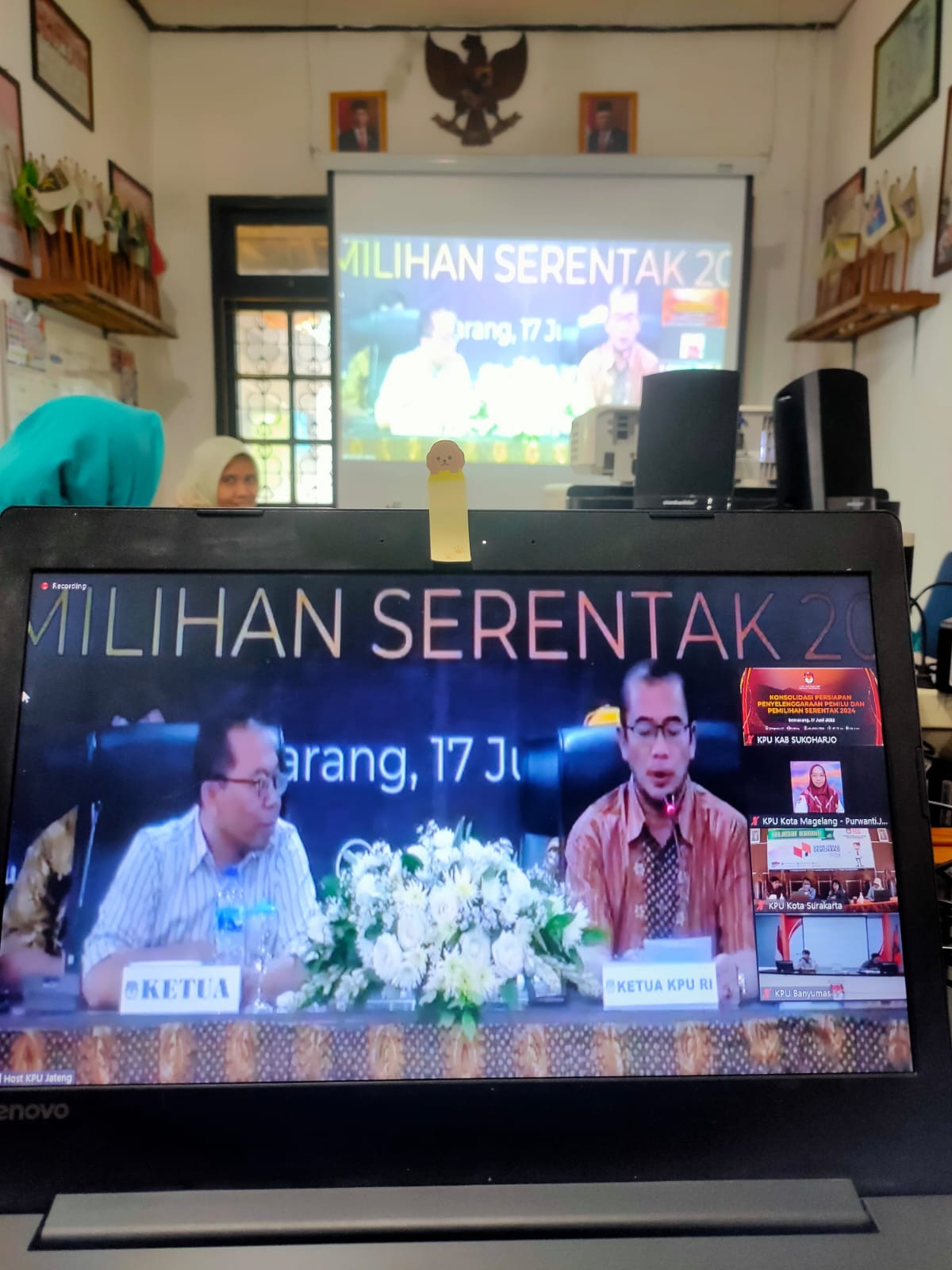 Sukoharjo, kpu.go.id - Ketua KPU Sukoharjo Nuril Huda dan Anggota, Sekretaris beserta jajaran mengikuti peluncuran tahapan Pemilu 2024 secara daring lewat kanal YouTube KPU RI, Selasa malam (14/6/22) di Pendopo kantor KPU Sukoharjo. Acara peluncuran tahapan Pemilu 2024 dibuka secara resmi oleh Ketua Komisi Pemilihan Umum ( KPU ) Hasyim Asy’ari Peluncuran ditandai dengan menekan sirine. “Malam ini 14 Juni 2022 , dihitung mulai 14 Februari 2024 yakni hari pemungutan suara, maka tepat hari ini 20 bulan sebelum hari pemungutan suara. Menurut mandat konstitusi dan undang-undang hari ini dimulainya tahapan Pemilu 2024, “ ujar Hasyim. Salah satu prinsip demokrasi yang kita kenal adalah musyawarah untuk bermufakat , didalamnya terdapat gambaran konflik karena memiliki pandangan, pendapat, dan kepentingan masing-masing. Muaranya yang dicari dan dituju adalah mufakat. Maka pemilu bisa dimaknai arena musyawarah besar rakyat Indonesia untuk memilih pemimpin-pemimpinnya, untuk menata kemajuan bangsa ke depan dalam bingkai Negara Kesatuan Republik Indonesia, tutur Hasyim dalam pidatonya. Seremonial peluncuran tahapan Pemilu 2024 yang menandakan dimulainya secara resmi tahapan Pemilu 2024 ini bertempat di Kantor KPU RI, Jalan Imam Bonjol, Menteng, Jakarta Pusat, dihadiri pejabat terkait dan tokoh politik antaralain Sekjen PAN Eddy Soeparno, Menteri Dalam Negeri (Mendagri) Tito karnavian, Menteri Komunikasi dan Informatika (Menkominfo) Johnny G Plate, Ketua Dewan Kehormatan Penyelenggara Pemilu (DKPP) Muhammad, dan Ketua Bawaslu Rahmat Bagja. KPU Sukoharjo mengikuti peluncuran tahapan Pemilu 2024 dengan mengelar nonton bareng yang dihadiri sejumlah pejabat seperti Ketua Bawaslu Sukoharjo Bambang Muryanto, Kejaksaaan Negeri Sukoharjo Aspi Riyal Juli Indarman, SH. MH, Kodim 0726 Sukoharjo Mayor Muchksin, Wakapolres Sukoharjo Kompol Teguh Prasetyo, S.Pd., M.H, DPRD diwakili Basuki Budi Santoso ,SH.MH, Kesbangpol, Disdukcapil, FKUB, PCNU. Juga tampak hadir perwakilan sejumlah parpol yakni PDI Perjuangan, Golkar, Gerindra, PKB, PAN, Nasdem, Perindo, PSI, dan Gelora. Ketua KPU Sukoharjo Nuril Huda menyatakan kesiapannya mengikuti semua tahapan Pemilu 2024. “ Ya, sesuai dengan konstitusi tahapan Pemilu 2024 dimulai hari ini, Selasa (14/6/22), ditandai dengan kegiatan peluncuran tahapan Pemilu 2024. Kami jajaran KPU Sukoharjo siap melaksanakan dan mensukseskan tahapan Pemilu 2024. dengan pelayanan prima senyum bahagia.” Ujarnya. Lebih lanjut ia menyatakan memaparkan tahapan-tahapan dalam Pemilu 2024 akan dimulai dengan tahapan perencanaan program dan anggaran serta penyusunan peraturan pelaksanaan penyelenggaraan pemilu. Tahapan berikutnya pemutakhiran data Pemilih dan penyusunan daftar Pemilih; pendaftaran dan verifikasi peserta pemilu; penetapan peserta pemilu; penetapan jumlah kursi dan penetapan daerah pemilihan. Berikutnya pencalonan Presiden dan Wakil Presidem serta anggota DPR, DPD, DPRD provinsi dan DPRD kabupaten/kota. Dilanjutkan masa kampanye pemilu; masa tenang; pemungutan dan penghitungan suara; penetapan hasil pemilu dan pengucapan sumpah/janji Presiden dan Wakil Presiden serta anggota DPR,DPD, DPRD Provinsi dan DPRD kabupaten/kota. Semua tahapan Pemilu 2024 tersebut sebagaimana tertuang dalam Peraturan KPU Nomor 3 tahun 2022 tentang Tahapan dan Jadwal Penyelenggaraan Pemilu 2024, tambahnya lagi. (SH)