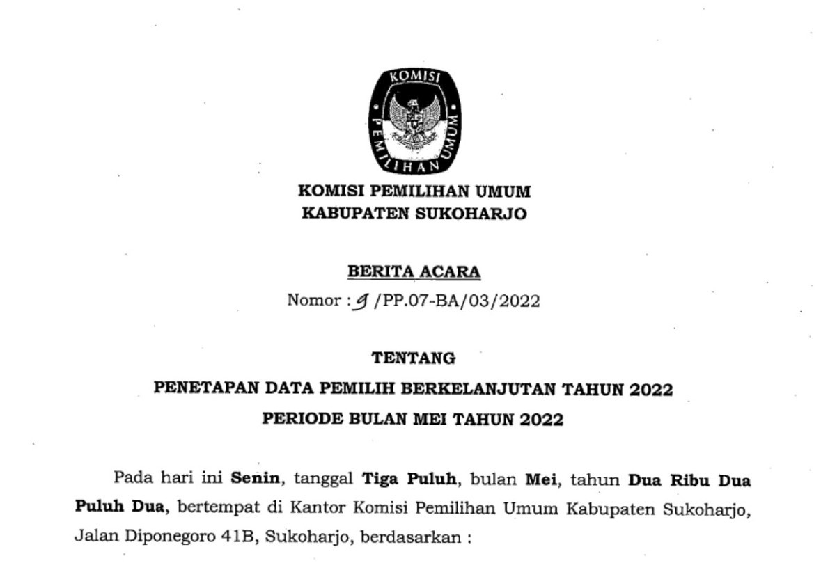 Pada hari Senin tanggal 30 Mei tahun 2022, KPU Kabupaten Sukoharjo menyelenggarakan rapat pleno PDPB edisi bulan Mei tahun 2022, di Kantor KPU Kab. Sukoharjo, Tampak hadir Ketua KPU Kab. Sukoharjo, Nuril Huda dan seluruh anggota KPU Kab. Sukoharjo serta Sekretaris KPU Kab. Sukoharjo, Suhadi.