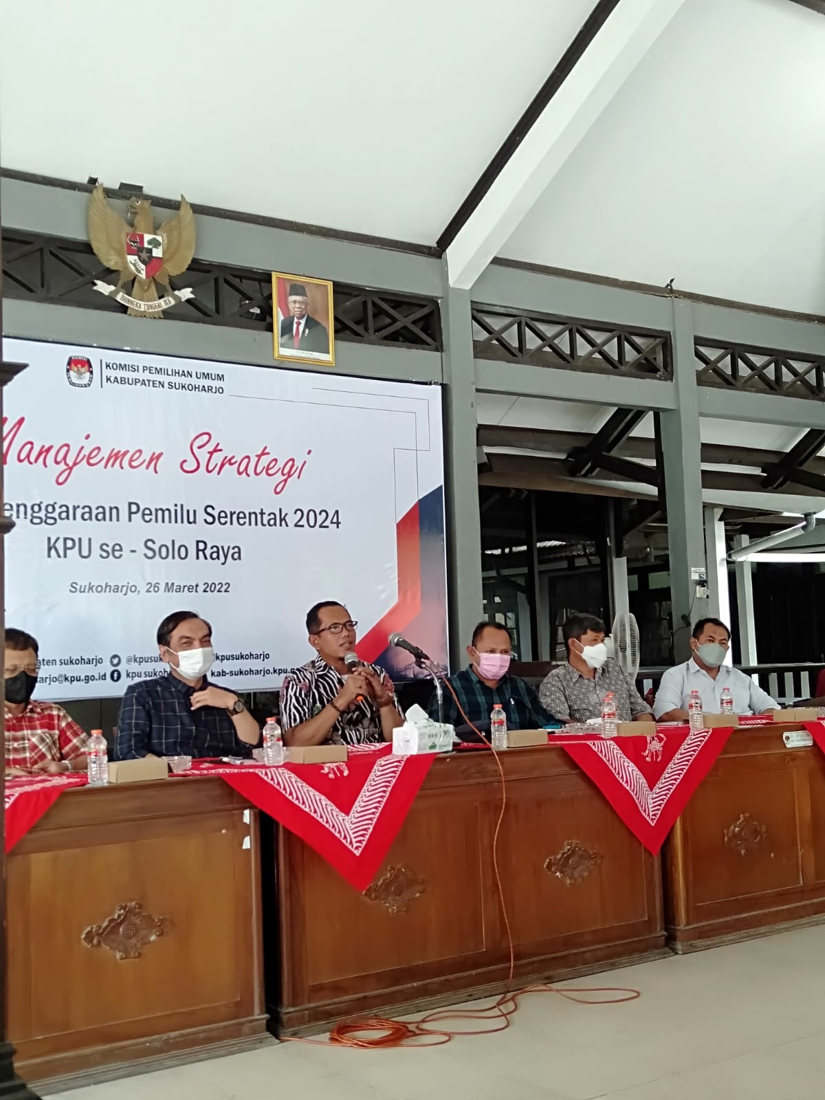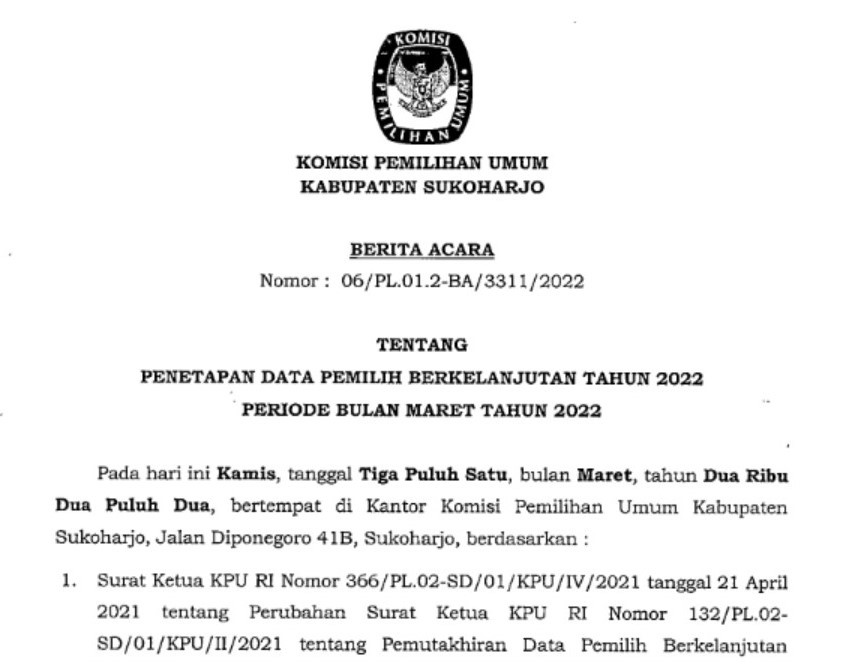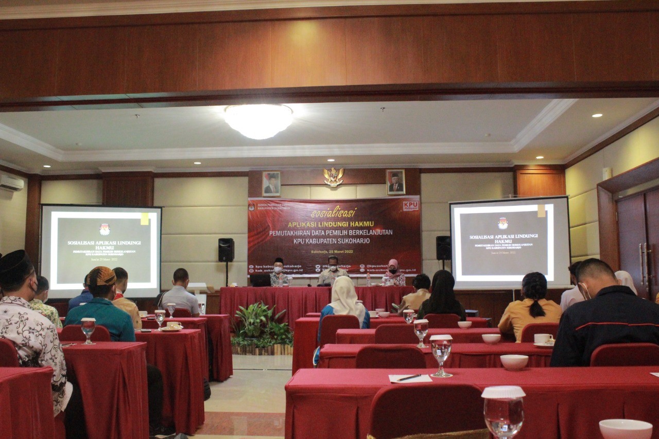 Siaran Pers Pemutakhiran Data Pemilih Berkelanjutan Bulan Maret 2022 Mendasarkan Peraturan Komisi Pemilihan Umum (PKPU) Nomor 6 tahun 2021, tentang Pemutakhiran Data Pemilih Berkelanjutan (PDPB), disebutkan bahwa KPU Kabupaten/Kota berwenang menyelenggarakan forum koordinasi PDPB setiap 3 (tiga) bulan sekali untuk mendapatkan masukan mengenai data pemilih dari instansi terkait dan/atau masyarakat. KPU Kabupaten Sukoharjo melaksanakan Rapat Koordinasi PDPB edisi bulan Maret 2022, di Pendopo KPU, pada Kamis (31/3/2022). Tampak hadir diantaranya, Bambang Muryanto, Ketua Bawaslu Kabupaten Sukoharjo, Muladi Wibowo, Anggota Bawaslu Kabupaten Sukoharjo, Perwakilan dari Disdukcapil, Kodim 0726 Sukoharjo, Polres Sukoharjo, Kemenag Sukoharjo. Hadir pula Perwakilan Partai Politik diantaranya Partai Golkar, PDIP, PKS, Nasdem, Gerindra, PSI, Perindo, dan Partai Gelora. Ketua KPU Kabupaten Sukoharjo, Nuril Huda yang didampingi semua anggota dan sekretaris KPU Kab. Sukoharjo, dalam sambutannya menegaskan bahwa pelaksanaan Rapat Koordinasi Pemutakhiran Data Pemilih Berkelanjutan (PDPB) berdasarkan Pasal 20, UU Nomor 7 Tahun 2017 tentang Pemilihan Umum, KPU Kabupaten/Kota berkewajiban melakukan pemutakhiran data pemilih secara berkelanjutan dengan memperhatikan data kependudukan sesuai ketentuan peraturan perundang-undangan. Pasal 204, UU Nomor 7 Tahun 2017, KPU Kabupaten/Kota melakukan pemutakhiran data pemilih berdasarkan daftar pemilih tetap Pemilu terakhir yang dimutakhirkan secara berkelanjutan. Surat Dinas KPU RI Nomor 132 Tahun 2021, Pemutakhiran, Surat Dinas KPU RI Nomor 366 Tahun 2021 tentang Data Pemilih Berkelanjutan Tahun 2021 dan, perihal Pemutakhiran Data Pemilih Berkelanjutan Tahun 2021. Dan PKPU Nomor 6 Tahun 2021, Tentang Pemutakhiran Data Pemilih Berkelanjutan (PDPB). Sedangkan tujuan PDPB, pertama memelihara, memperbaharui, dan mengevaluasi DPT Pemilu atau Pemilihan terakhir secara terus menerus dan berkelanjutan yang digunakan untuk menyusun DPT pada Pemilu dan/atau Pemilihan berikutnya. Kedua, menyediakan data dan informasi Pemilih berskala nasional dan daerah mengenai data pemilih secara komprehensif, akurat dan mutakhir; dan Ketiga memutakhirkan data pemilih dengan menggunakan teknologi informasi dengan tetap menjamin kerahasiaan data. Dikatakan, Sasaran PDPB merupakan WNI yang berdomisili di wilayah NKRI dan/atau di luar negeri, harus memenuhi syarat ; 1. Genap berumur 17 tahun atau lebih, sudah kawin, atau sudah pernah kawin. 2. Tidak sedang dicabut hak pilihnya berdasarkan putusan pengadilan yg telah mempunyai kekuatan hukum tetap. 3. Berdomisili di wilayah NKRI yg dibuktikan dengan KTP-el. 4. Berdomisili di LN yang dibuktikan dengan KTP-el/atau Paspor. 5. Dalam hal pemilih belum mempunyai KTP-el, dapat menggunakan Surat Keterangan; dan Tidak sedang menjadi anggota TNI, atau Kepolisian Negara Republik Indonesia. Adapun rincian rekapitulasi data pemilih berkelanjutan periode Maret tahun 2022, jumlah Kecamatan sebanyak 12. Jumlah Desa/Kelurahan 167, Jumlah TPS 1.775, Jumlah Pemilih Laki-laki 326.773, jumlah pemilih perempuan 334.227, jumlah keseluruhan sebanyak 661.000, pemilih. Potensi pemilih Baru sebanyak 6 pemilih dan jumlah pemilih tidak memenuhi syarat (Meninggal) sebanyak 11 pemilih. Sedangkan jumlah pemilih bulan sebelumnya (Februari-red) sebanyak 661.005. Cecep Choirul Sholeh, Div Perencanaan Data dan Informasi KPU Kabupaten Sukoharjo, menjelaskan tentang aplikasi Lindungihakmu. Di https://play.google.com/store/apps/detail?id=com.kpu.ppdb. Semua peserta dipersilahkan untuk download aplikasi tersebut. Fitur aplikasi ini berisikan layanan antara lain, Pertama Cek Data Pemilih. Fitur untuk melakukan pencarian Pemilih dan pengecekan data Pemilih. Kedua, Rekapitulasi Data, Fitur yang menampilkan rekap data Pemilih dan data pemutakhiran dari tingkat nasional hinggaTPS. Ketiga, Daftar Jadi Pemilih, Fitur untuk mendaftarkan diri sebagai Pemilih. Keempat, Lapor TMS, Fitur untuk melaporkanPemilih yang sudah tidakmemenuhi syarat sebagai Pemilih. Tentang Aplikasi Lindungihakmu, Bambang Muryanto Ketua Bawaslu, menyarankan kepada KPU untuk merahasiakan data NIK, dan membuka nama pemilik NIK. Saat ini, kata Bambang, dalam aplikasi justru nama pemiliknya yang dirahasiakan sedangkan NIK-nya terbuka. Masukan lain, Muladi Wibowo, dalam Rakor kedepan berharap kepada KPU mengundang elemen masyarakat lain seperti camat, kepala desa, dan intansi terkait lainnya. Perwakilan Partai Golkar, Ihsan Soedjanto, menanyakan bagaimana mekanisme permohonan DPT Pemilu tahun sebelumnya. Priyono Perwakilan Disdukcapil mengapresiasi pelaksanaan Rapat Koordinasi PDPB edisi bulan Maret 2022. Sukoharjo, 1 April 2022 Ketua KPU Kabupaten Sukoharjo TTD Nuril Huda, SH.I. MH BERITA ACARA DIUNDUH DISINI