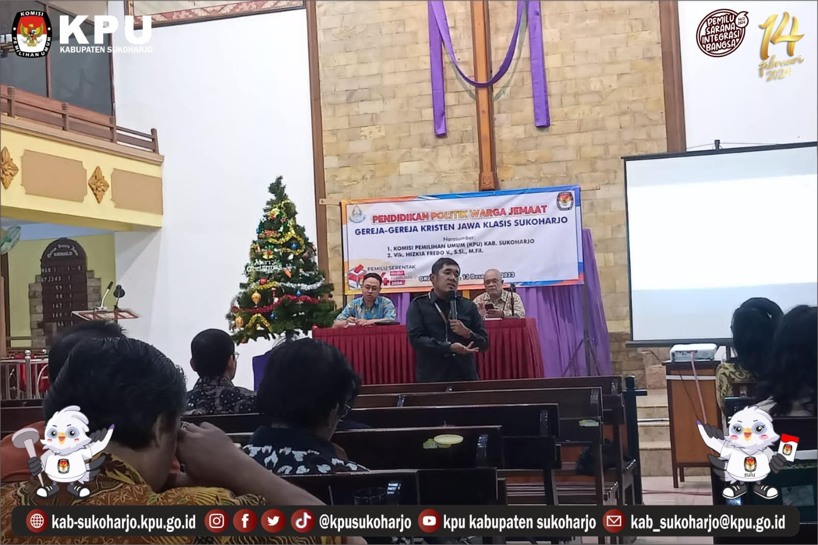Anggota KPU Kabupaten Sukoharjo Divisi Sosdiklih, Parmas & SDM Moerwedhy Tanomo Menghadiri undangan Pendidikan Politik Warga Jemaat Gereja-Gereja Kristen Jawa Klasis Sukoharjo di Gereja Kristen Jawa Sukoharjo, Kamis (14/12/2023).