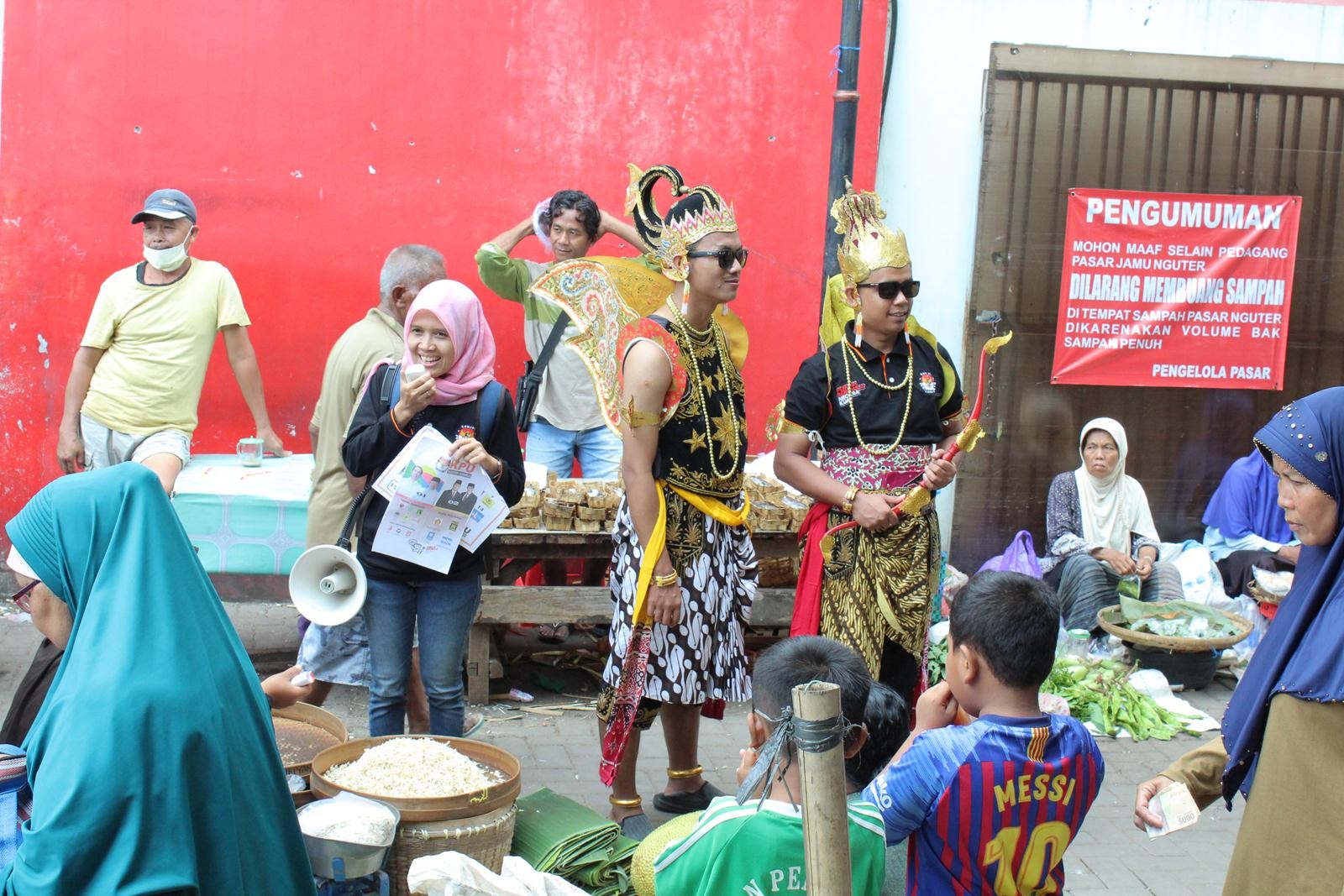 Pedagang tampak antusias dan tertarik dengan tim yang beranggotakan tokoh wayang, tak heran banyak mengerumuni dan minta foto bersama.