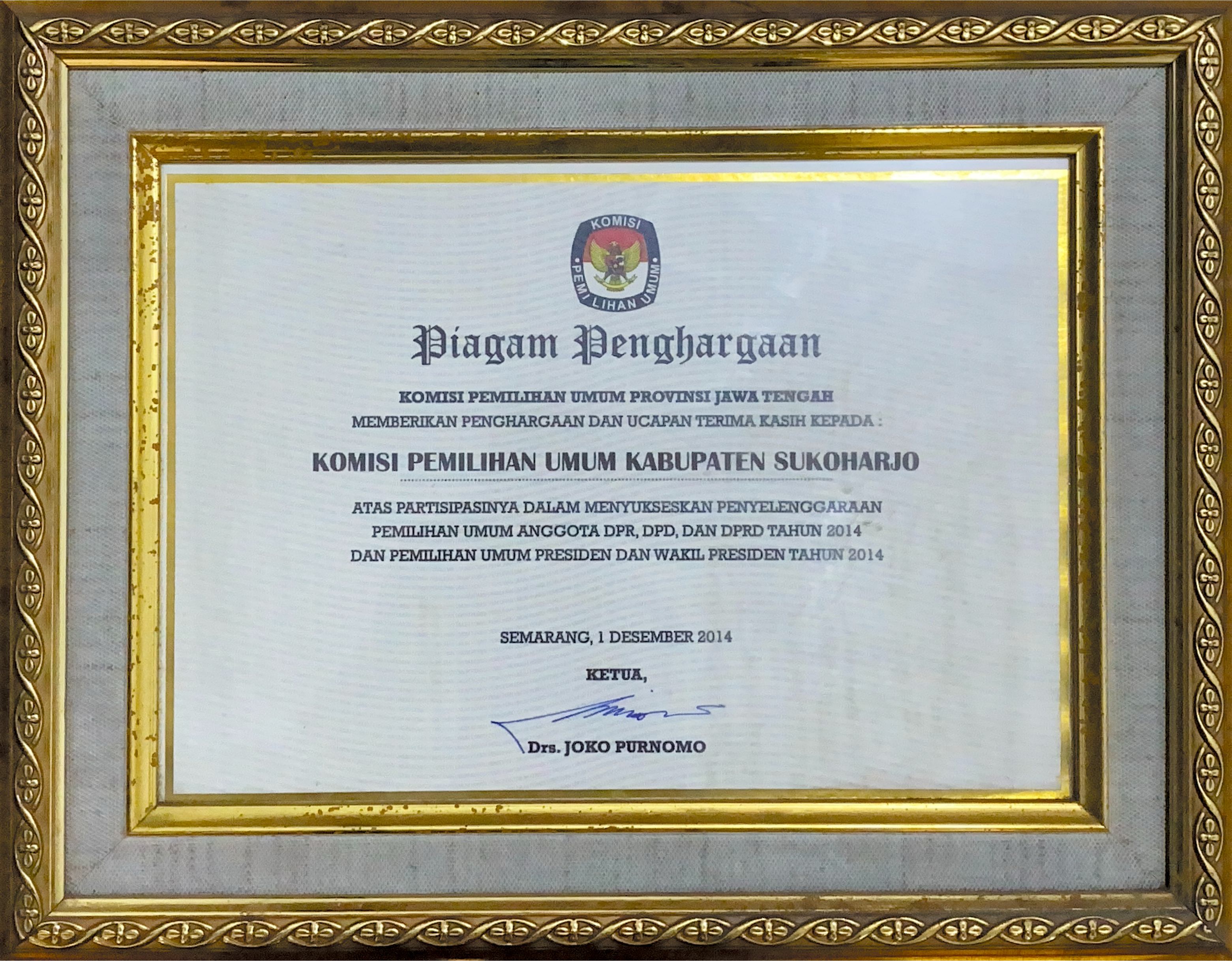 1. Piagam Penghargaan atas Partisipasinya dalam Penyelenggaraan Pemilihan Umum Anggota DPR, DPD, dan DPRD Tahun 2014 dan Pemilihan Umum Presiden dan Wakil Presiden Tahun 2014.