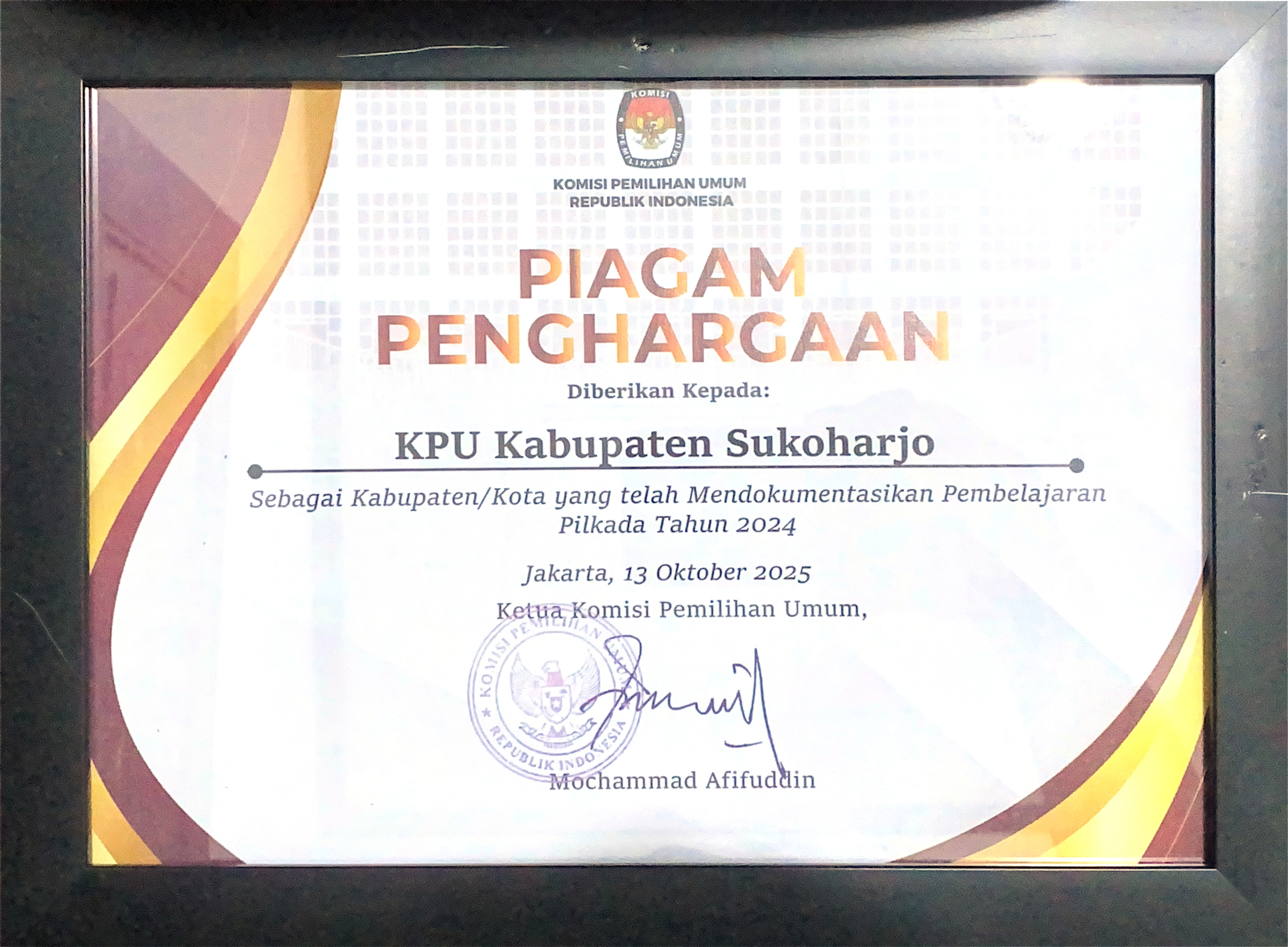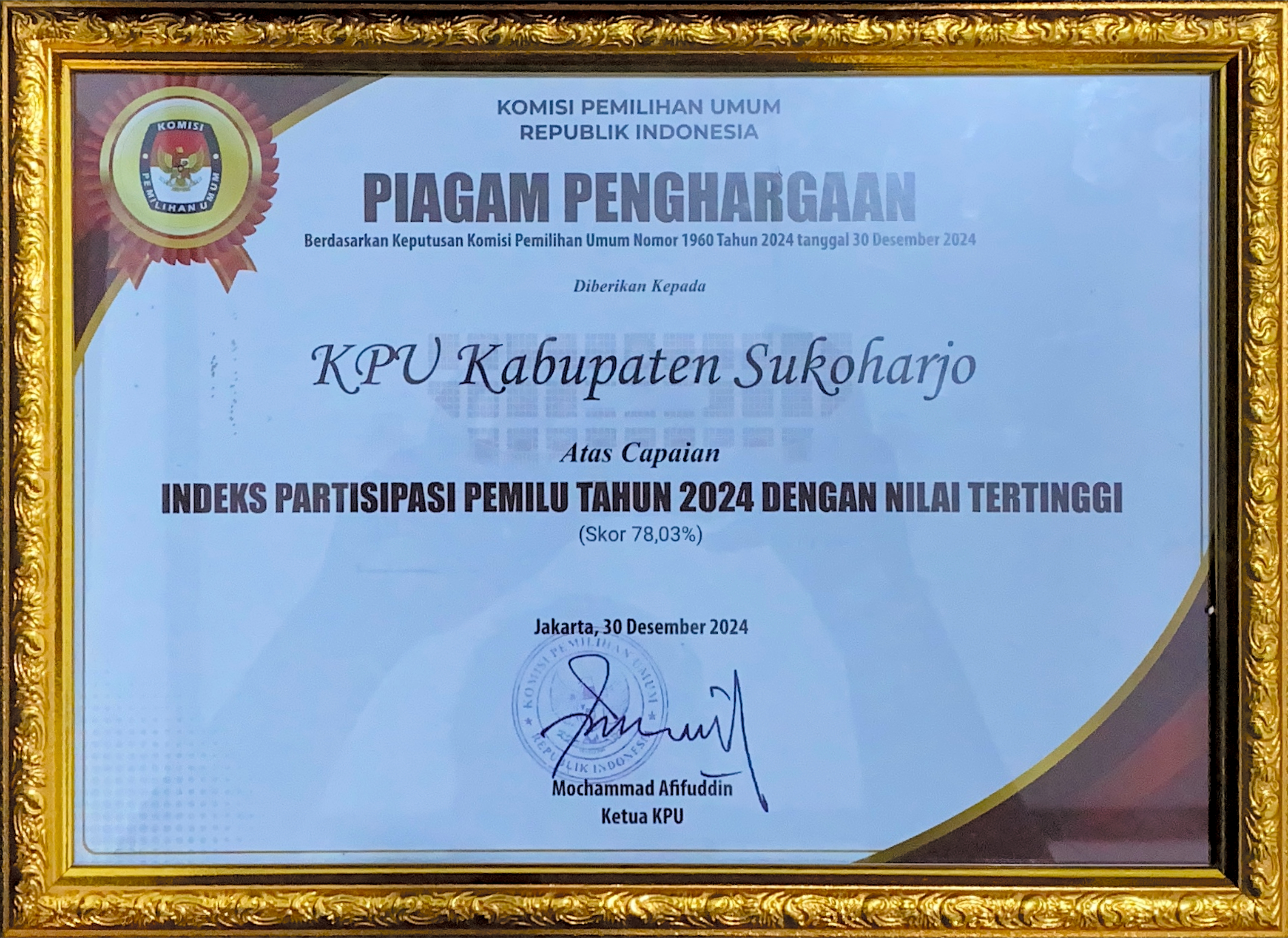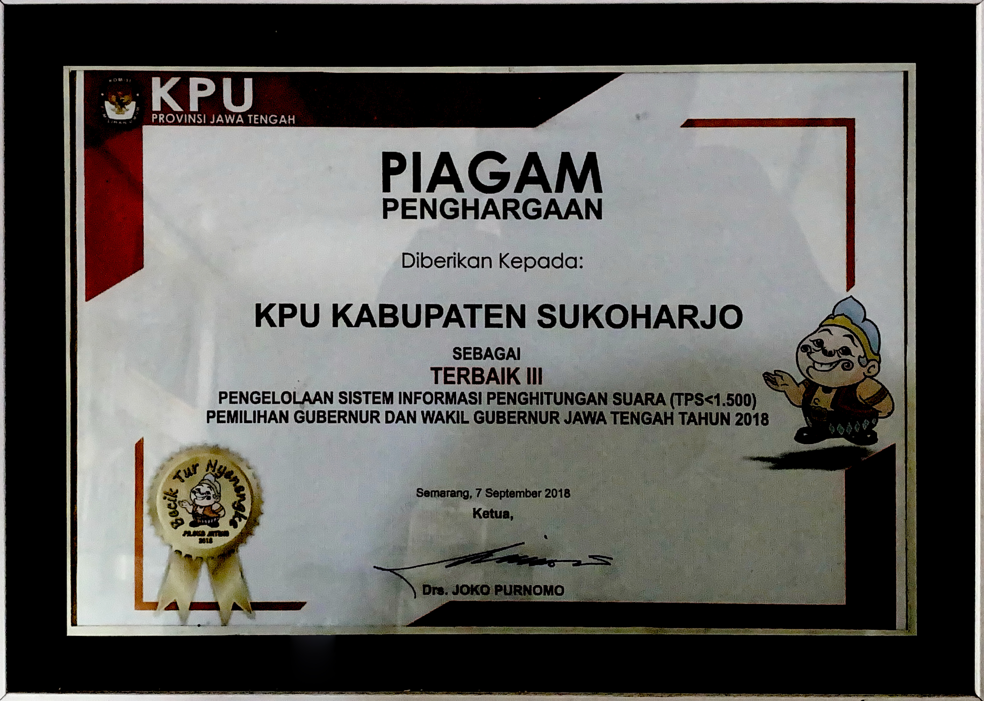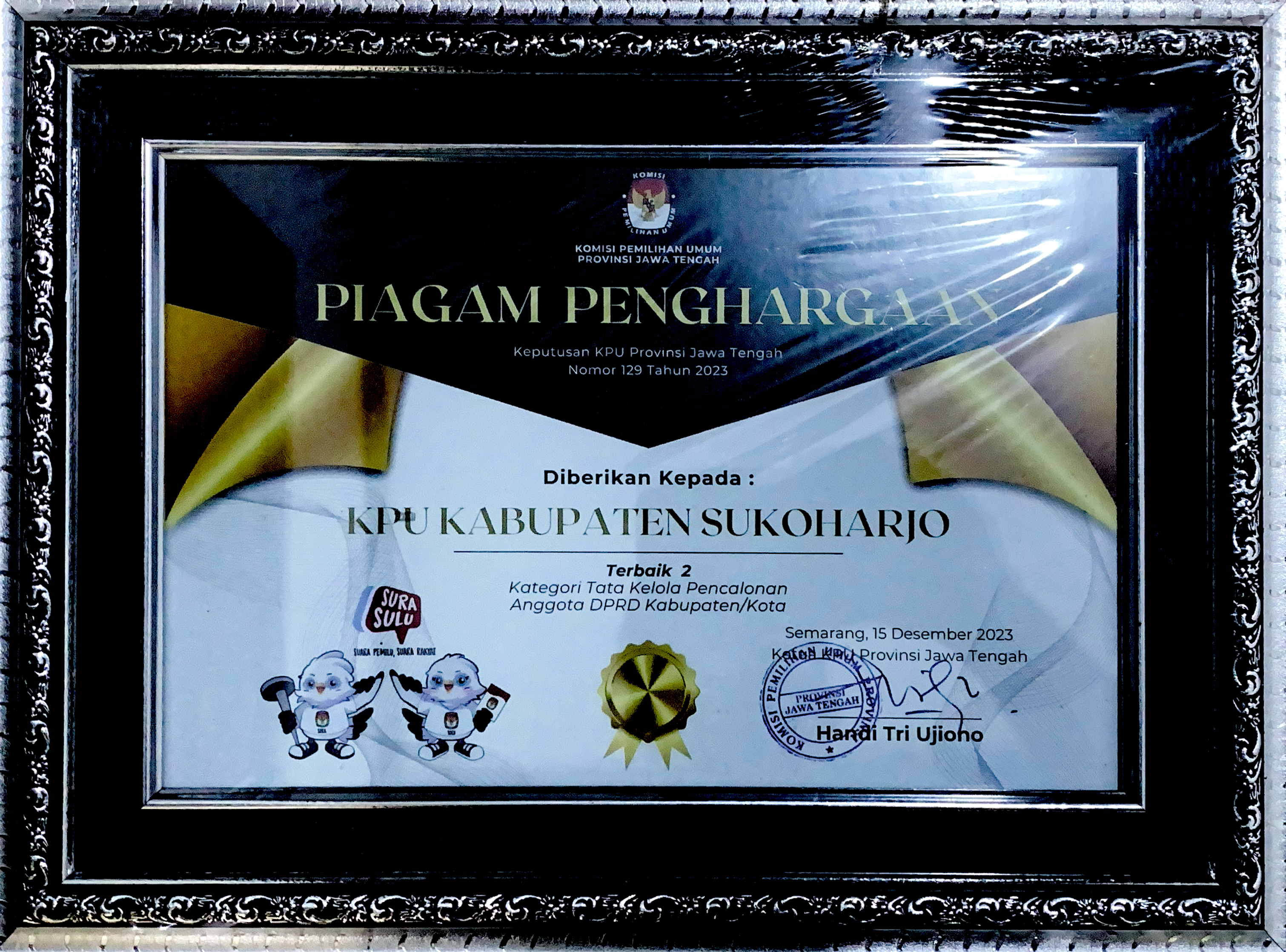 BERIKUT PIAGAM PENGHARGAAN KPU KABUPATEN SUKOHARJO ATAS CAPAIAN DALAM PEMILU MAUPUN PEMILIHAN