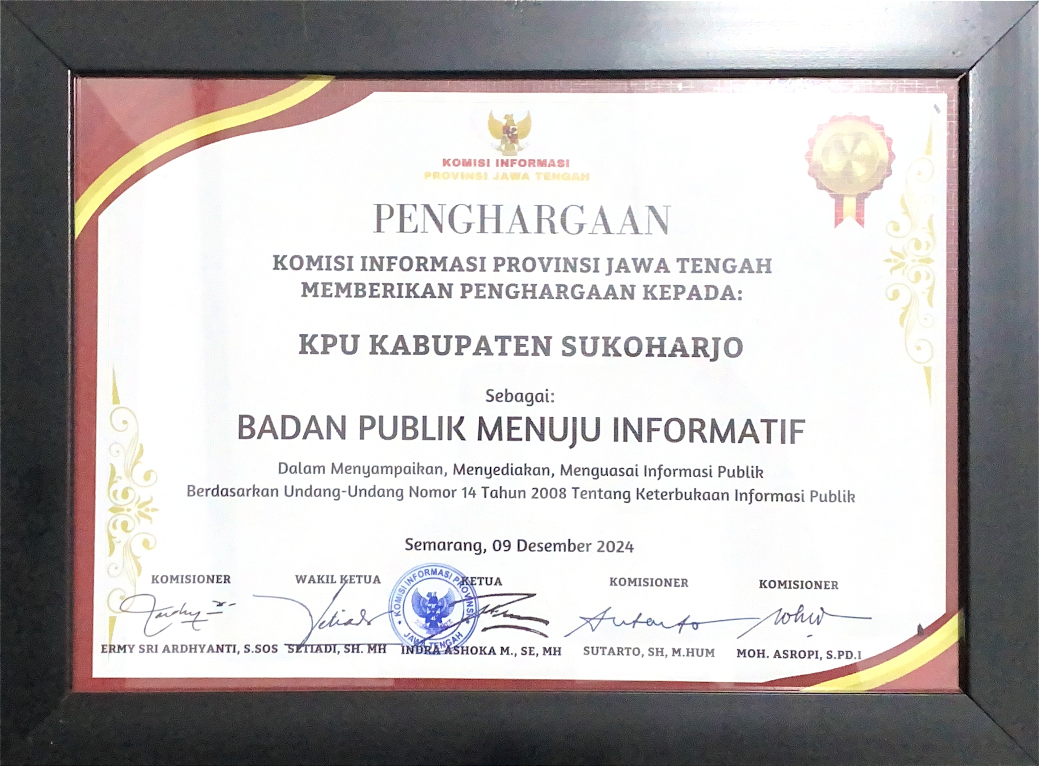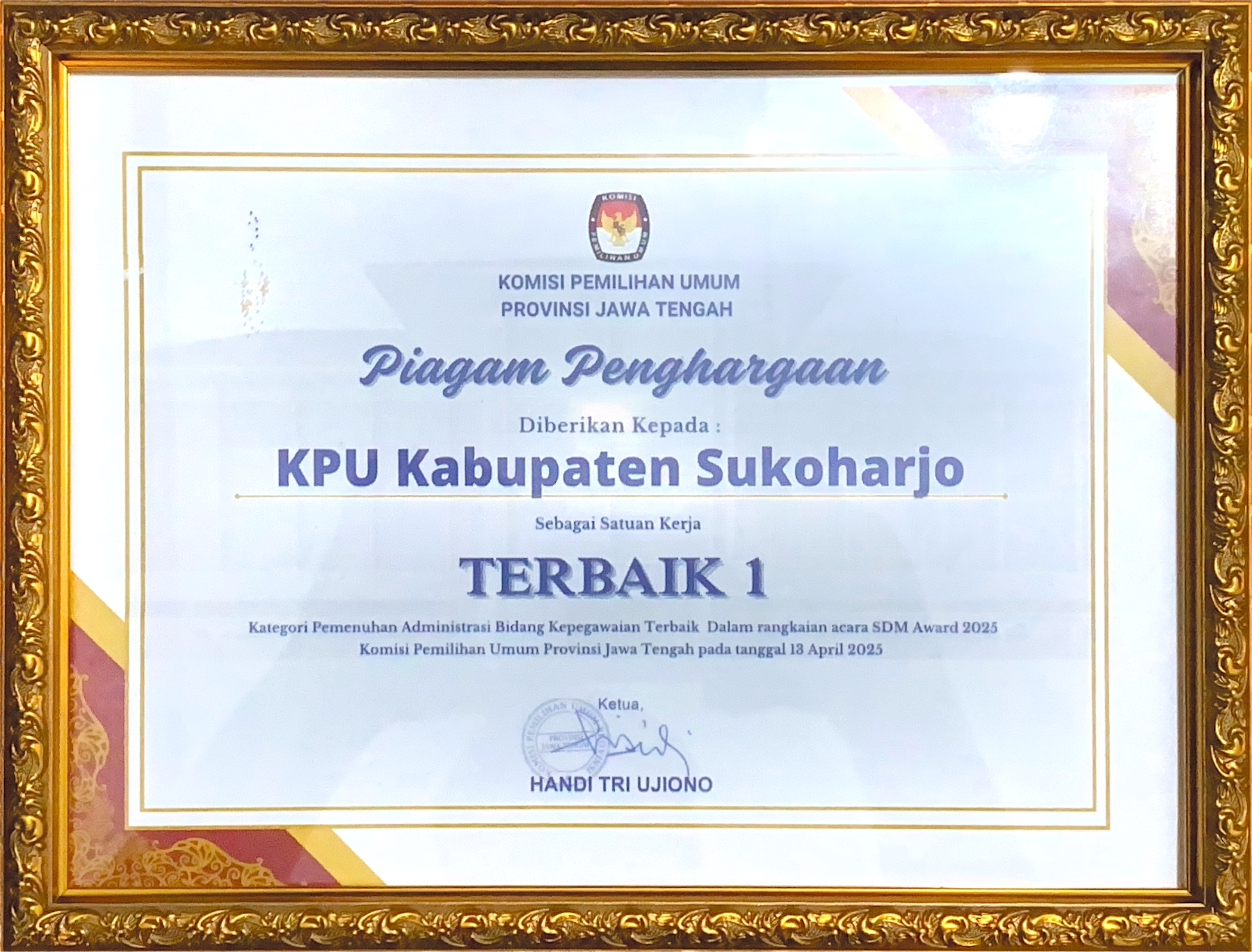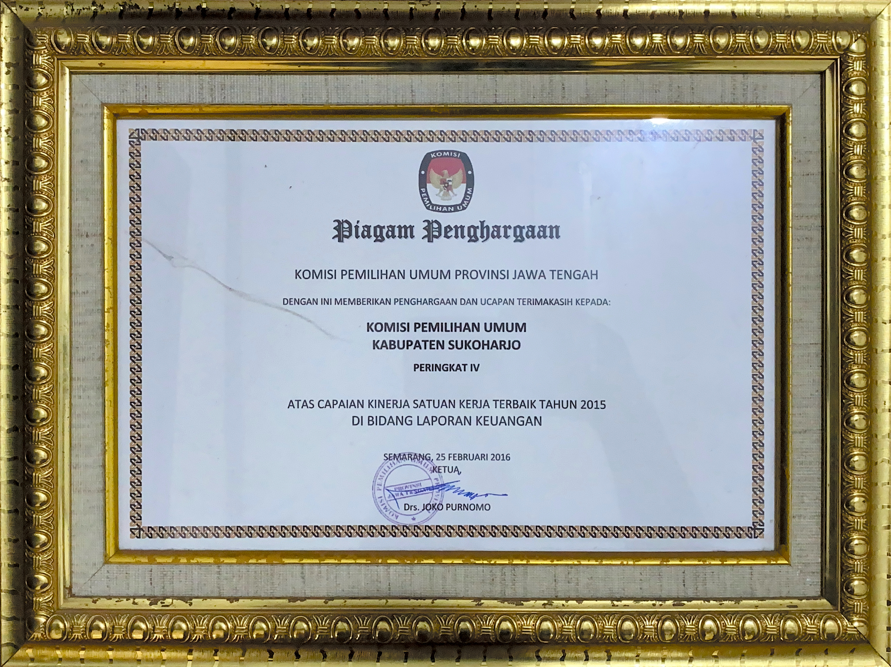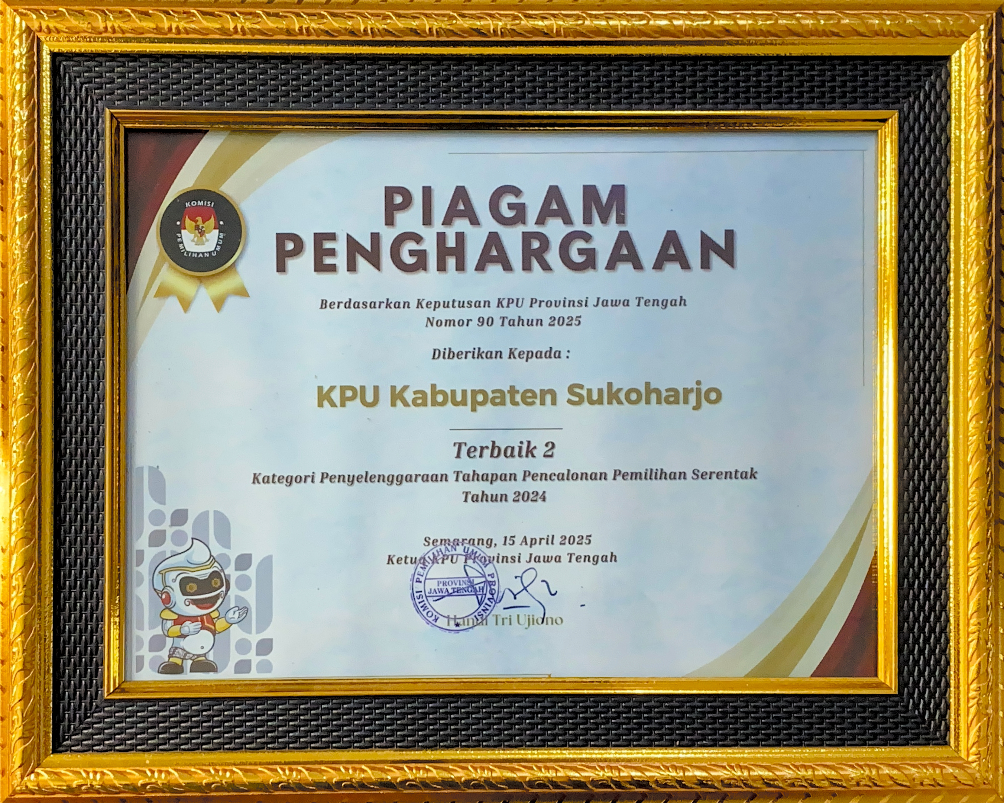 BERIKUT PIAGAM PENGHARGAAN KPU KABUPATEN SUKOHARJO ATAS CAPAIAN DALAM PEMILU MAUPUN PEMILIHAN
