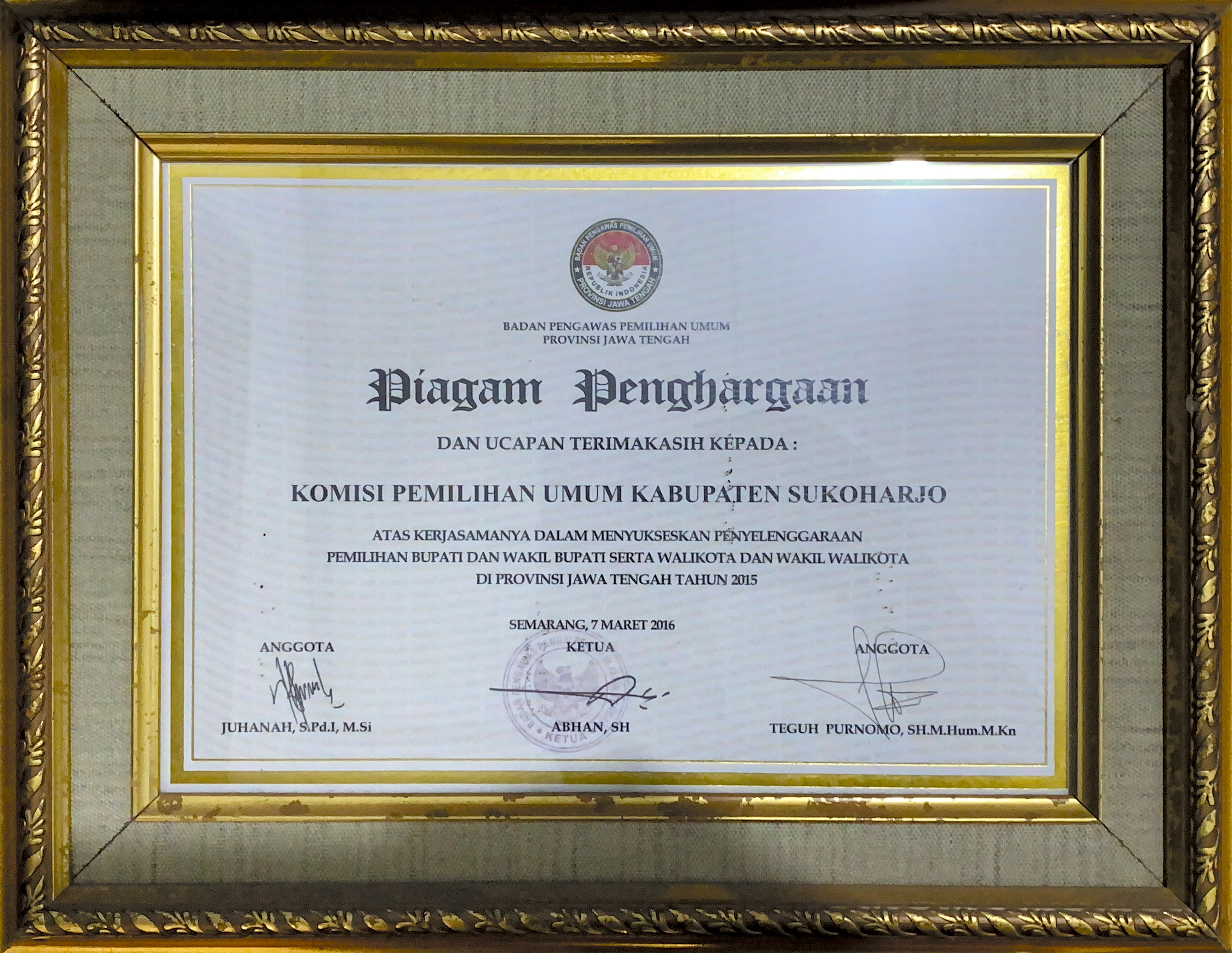 3. Piagam Penghargaan atas Kerjasamanya dalam Menyukseskan Penyelenggaraan Pemilihan Bupati dan Wakil Bupati serta Walikota dan Wakil Walikota di Provinsi Jawa Tengah Tahun 2015